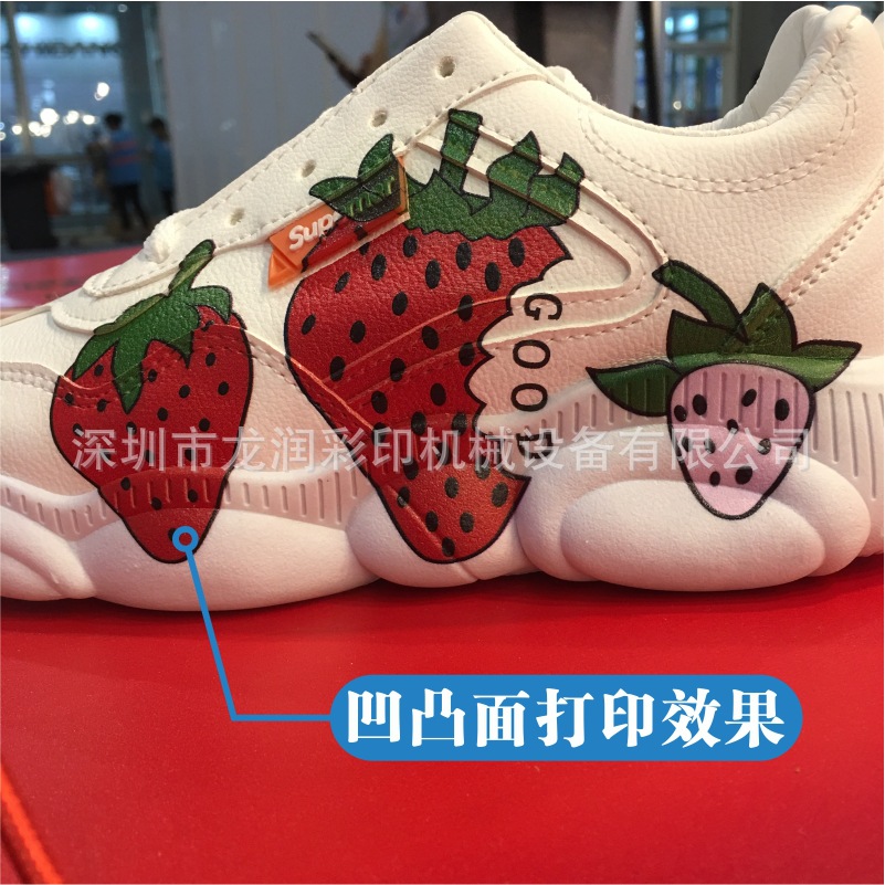 龍潤LR-2513 uv打印機實現從2.5毫米打印距離到2.5厘米打印距離的,直接打印高弧度,實現uv打印高弧面,uv打印異形,uv打印鞋面,uv打印凹凸面,uv打印玩具等高落差產品,無需制版,直接打印。2513UV高落差平板噴墨打印機是針對鞋子/鞋材行業(yè)的專用機型,其有高落差、高噴射、打印精度高、質量好、色彩鮮艷、打印速度快、圖案清晰亮麗、不掉色等特點。打印落差25mm不飛墨,打印方便,無需制版,只要有圖片,連接一臺電腦就可以直接在成品鞋或者鞋材上面印刷自己想要的3D圖案。因為設備針對不同客戶,不同行業(yè),所以在機器配置和機器大小選購方面存在差異,價格也高低不一,客戶在購買機器前務必要咨詢銷售人員,我們才能推薦適合您的機器。